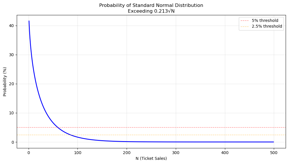 Having approximated the fixed price payouts as normally distributed, we can find the Z-score via conversion to a standard normal distribution. The strong loss threshold we are looking at is \(0.703N\), which converts to the Z-threshold as \(\frac{0.703N-\mu}{\sigma} = 0.213\sqrt{N}\)