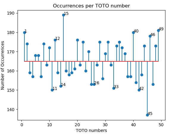 Here we see a plot for all 49 TOTO numbers on the horizontal axis, and the number of occurrences on the vertical axis. The red horizontal line depicts the expected number of occurrences for the dataset (164.86). Hot numbers appear above the line, Cold numbers appear below the line.