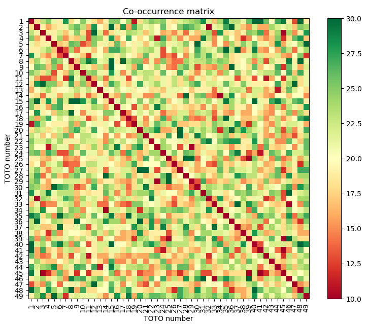 Lets first visualise the co-occurrences of every pair of numbers in a heatmap plot. The plot is symmetrical about its diagonal, because the number of occurrences for TOTO number pair \((a,b)\) is the same as pair \((b,a)\). The diagonal for pair \((a,a)\) is ignored and arbitrarily set to 0. Green boxes indicate pairs that are drawn frequently, while red boxes indicate rarely drawn pairs.