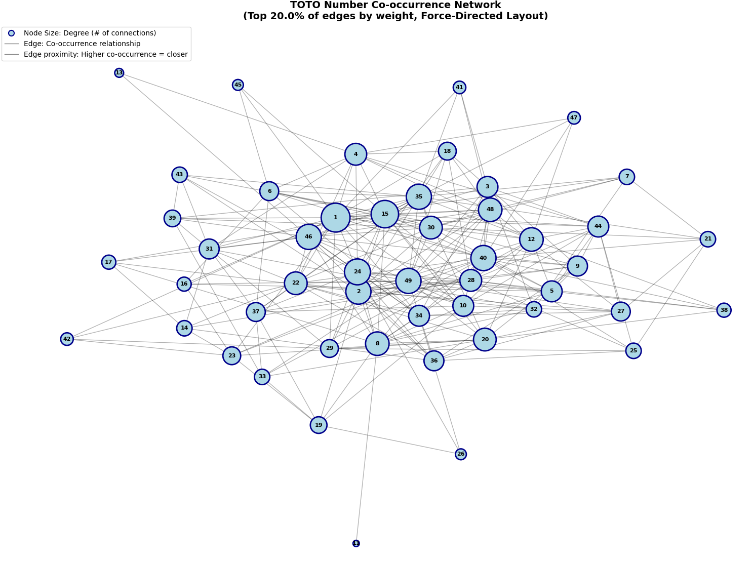 The heatmap contains useful information, but is difficult to read in detail. We can visualise it as a network graph, with each node representing a single TOTO number. Connections (i.e. edges) between the TOTO numbers represent pairs, and the closer the nodes are to each other, the more frequently the corresponding pairs occur in the dataset. The larger the node, the more connections it has.