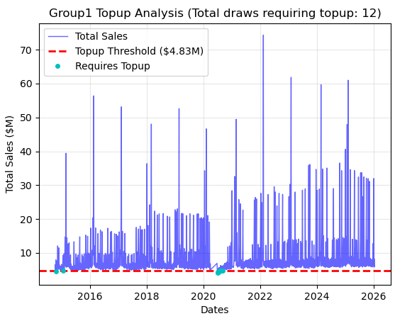 Now, lets see if condition 1 for weak loss has ever occurred in our dataset. In the following figure, we plot the total sales amount, compared against the $4.8M sales threshold where topup of group 1 prize is required.