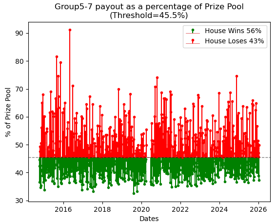 The actual impact of a weak loss can be measured when we assess both conditions as a whole. This is achieved by plotting the payouts for all groups as a percentage of total sales. With reference to the TOTO rules, Singapore Pools expects the sum of all payouts to be ≤54.5% of total sales.