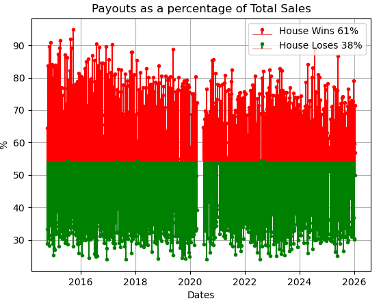 Note also that there have been no payouts >100% of total sales, which means that Singapore Pools have never experienced the “strong” definition of loss in any draw. By this definition of loss, Singapore Pools (a.k.a. “the House”) has indeed always won.