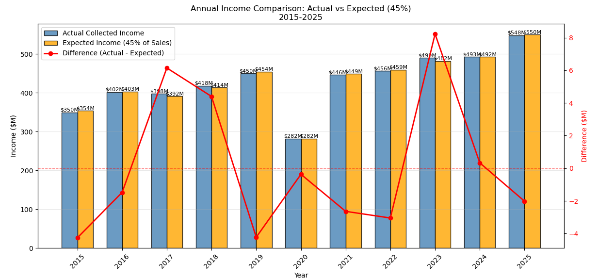 In this figure, we see Singapore Pools’ actual income versus expected income (45% of total sales) for each full year, from 2015 to 2025. The difference between actual and expected income is also plotted in the red lineplot. 7 out of the 10 years assessed showed lower-than-expected income, indicating weak loss.