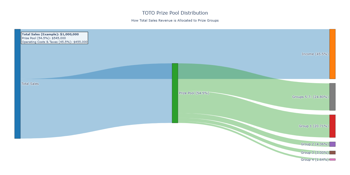 Simply put, only 54.5% of collected TOTO ticket sales is channelled into the prize pool. Singapore Pools skims 45.5% right off the top before the draw! Here’s a Sankey diagram, which also depicts the payouts for each group.