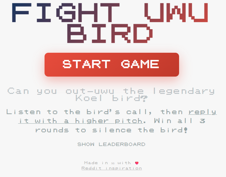 I made a simple game with a distinctly Singaporean flavour. Yes, I grew up in Singapore, waking up to the distinctive calls of the Koel bird (a.k.a. Uwu bird) which inspired this game. No, I don’t have any experience in full-stack development or the skills to build a web app. Yes, I have been using generative AI (specifically Claude Code) for more than a year now, increasing the my pace of development - on tasks that I personally know how to do. So what’s new?