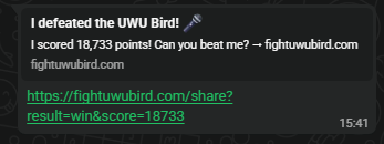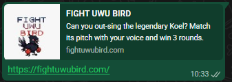 When I started testing it out with friends, I realised my link just looked this: https://fightuwubird.com. But sharing social posts on Whatsapp came with rich visual information (you can even play Instagram videos in the chat), which I wanted to mimic. I told Claude, and it told me about something called Open Graph protocol, and asked me for a display image. A quick paintjob later, and Claude implemented the Open Graph protocol so my links now look like this:
