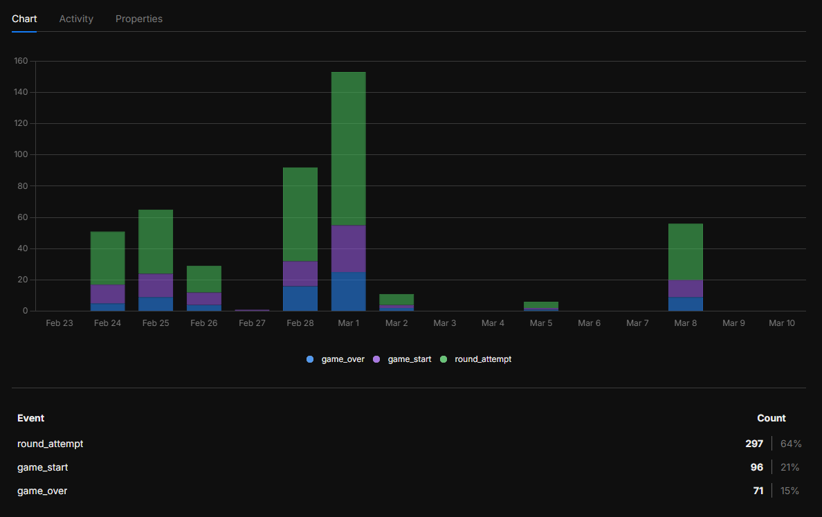 It’s been two weeks since the site went live, and we’ve gotten almost 300 rounds played so far. Friends have been generally supportive, and I’m happy with results after a weekend of work.